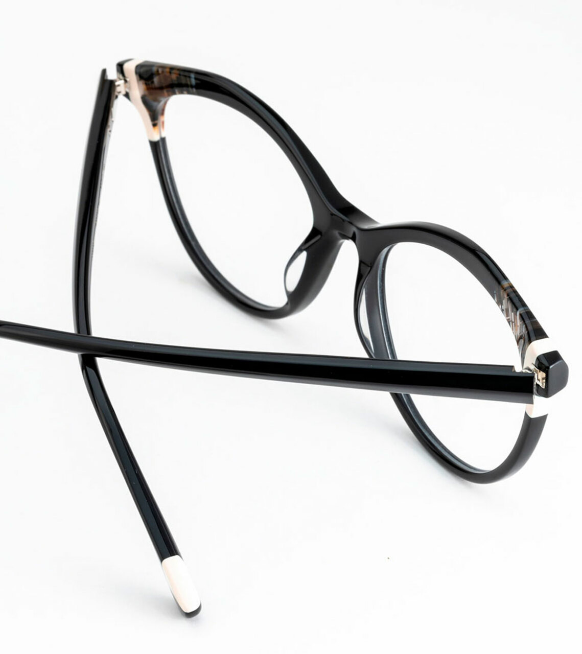 Elegante diseño de acetato fresado con laminados en el lateral. Varillas con incrustación de madera en el terminal y bisagras alemanas OBE Spike.