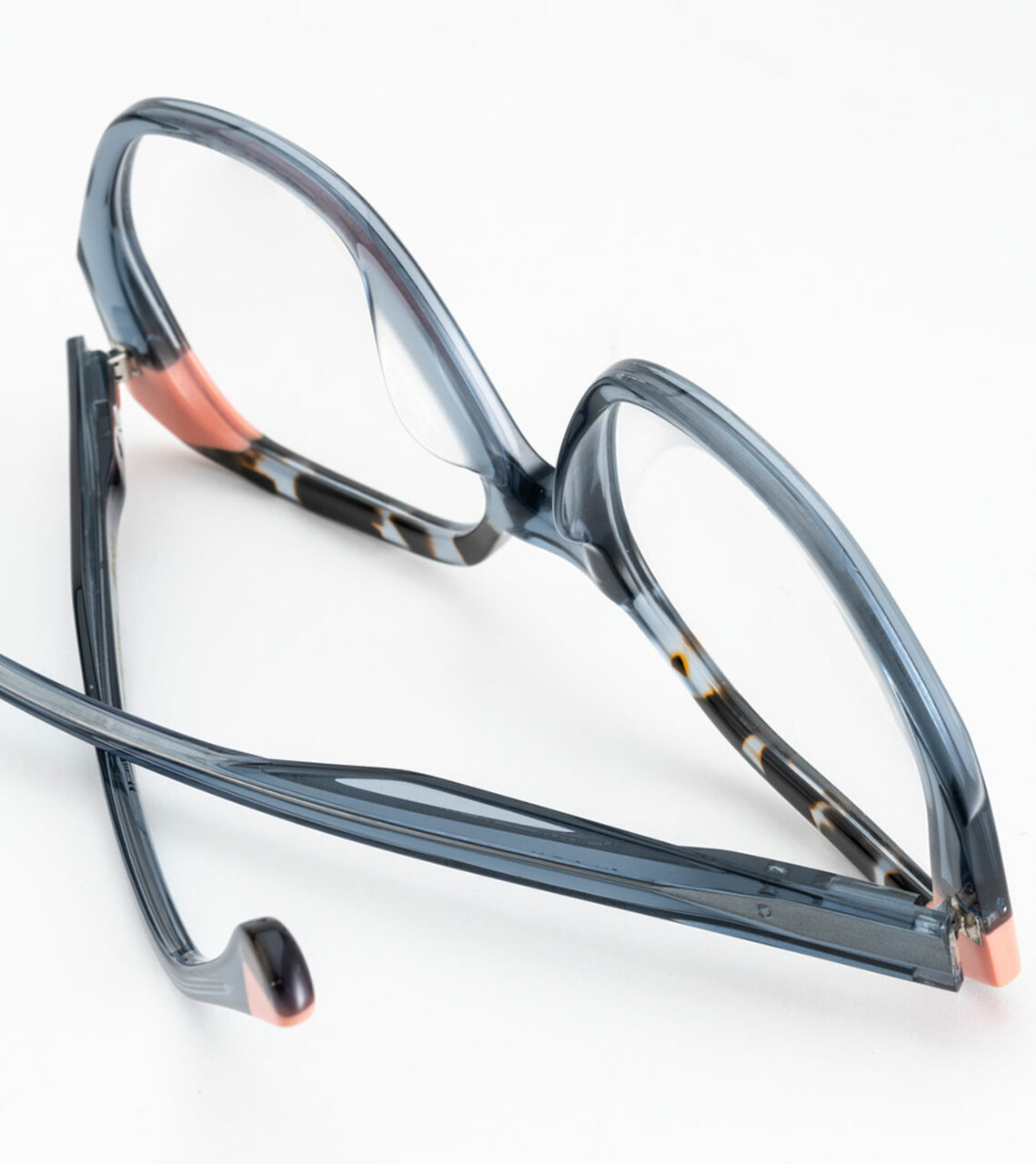 Montura de acetato fresado con triple laminado en el frontal. Varillas fresadas e incrustación de madera en el terminal. Bisagras alemanas OBE Spike.